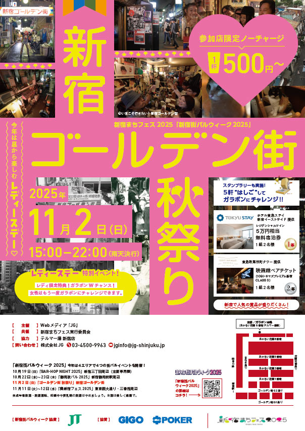 新宿ゴールデン街 秋祭り(終了しました)新宿ゴールデン街 秋祭り約280軒もの個性的な飲食店がひしめく、国内屈指の飲み屋街・ゴールデン街で気軽にはしご酒。戦後に誕生して以来、幾多の変遷を経て、輝き続ける同エリア。当日は、5軒はしごで豪華景品があたる抽選にチャレンジ!!今年の秋祭りはレディースデーの特典もあります!【開催場所】新宿ゴールデン街【開催日時】11月2日(日)15:00~22:00【イベントの楽しみ方】イベント参加店チャージ無料、1杯500円~