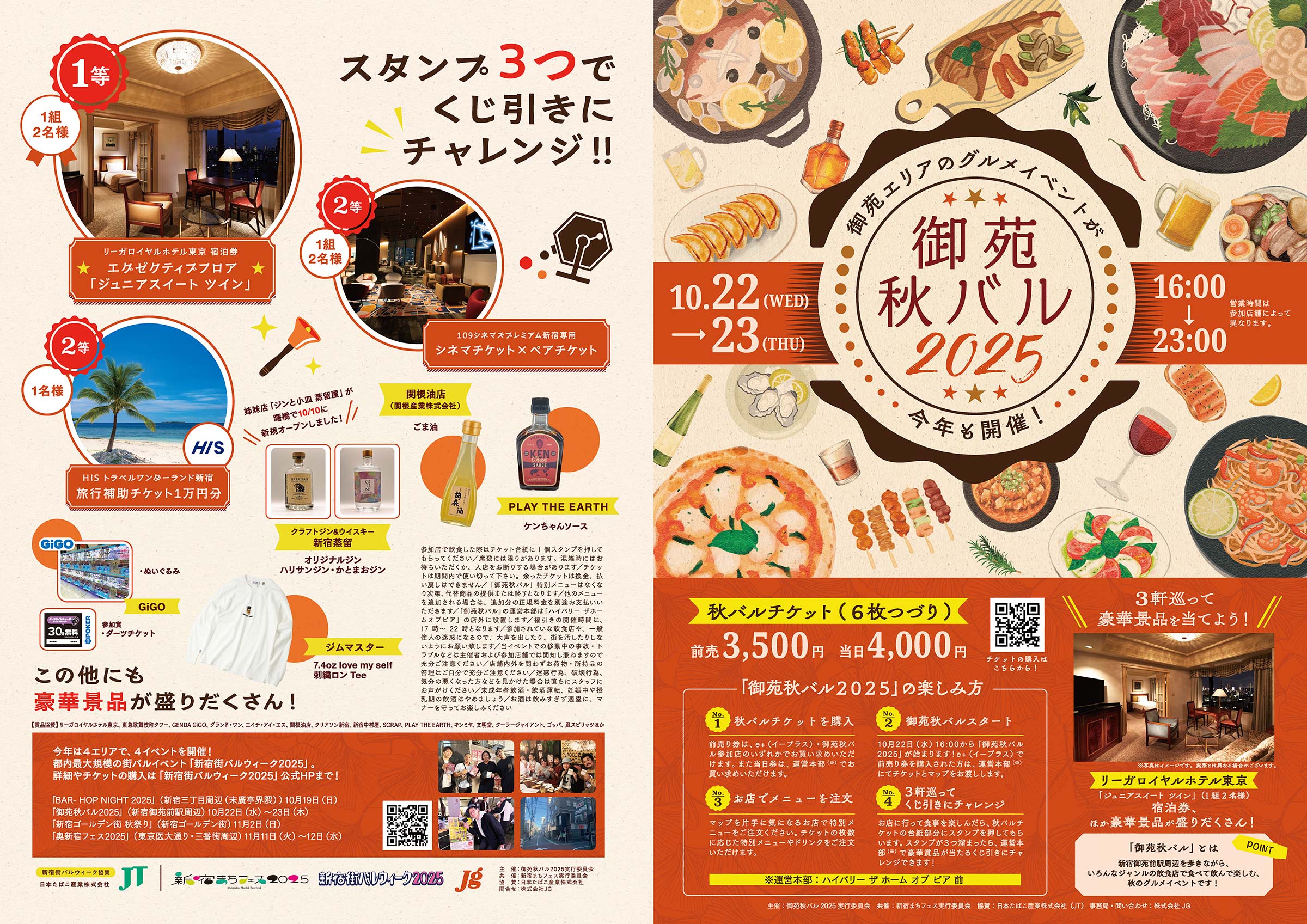 フレンチ、イタリアン、和食、アジア料理、中華料理、ビアバー、居酒屋、バーなど、カジュアルで落ち着いた、普段使いができるお店が並ぶ新宿御苑前駅周辺。『御苑秋バル』に参加してお気に入りのお店を見つけよう!